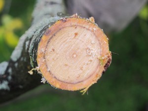 This is a branch cut from a Wych Elm infected by the Dutch Elm Disease fungus which is spread by the Scolytus Beetle. The tylosis staining is the dark brown ring in the xylem as shown. The tree basically lays down tyloses (balls of gum) in the xylem (water tubes) in an effort to stop the fungus from spreading; however in doing so the tree dehydrates and dies. Frontier is often asked to remove dying Elm branches to beyond the last sign of tylosis staining in an effort to save the tree and sometimes this works - which is good because it is cheaper than felling the whole tree!