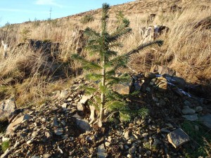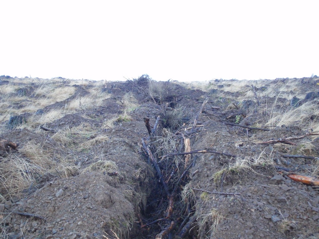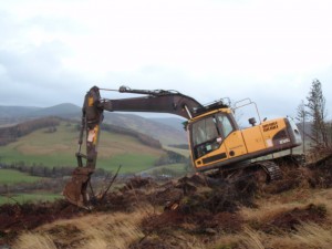 Christmas 2014: An excavator preparing a restock site for planting this season. Trench mounting or 'ditch and dolloping' is when the excavator moves up the brash-mat left over from the harvesting operation, digs a narrow trench and with this soil creates spaced mounds to the required stocking density on which to plant the new trees. The brash mat is pushed and compressed into the trench where it rots down fairly quickly. The site looks neater afterwards. There are microsite benefits to mound-planted trees including; reduction of competition by weeds thereby lowering overall establishment costs, increased root temperature (bare soil absorbs more daytime heat) resulting in good root growth and better drainage. All time-consuming work but the increased quality and value of the timber in the end makes it worthwhile.