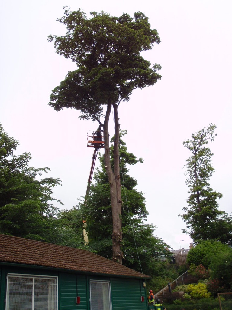 December 2021 - what an exiting way to spend a cold Monday. Our climbers were lifted into the large Corsican Pine tree using a mobile cable crane from Bernard Hunter and thereafter dismantled the tree, with plenty of local interest. This tree had to be removed as it was damaging the neighbour's garage! The road had to be closed by Class One Traffic Management and by gaining a Road Occupation Permit from Edinburgh Council.