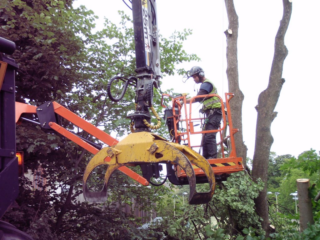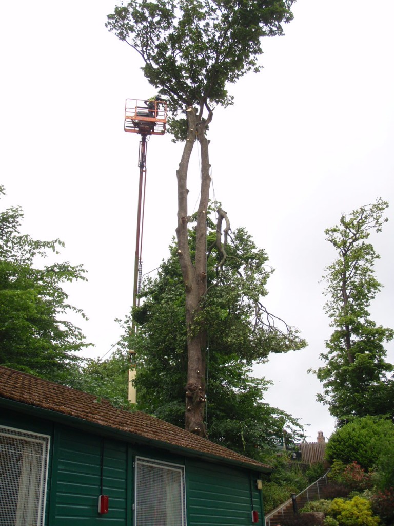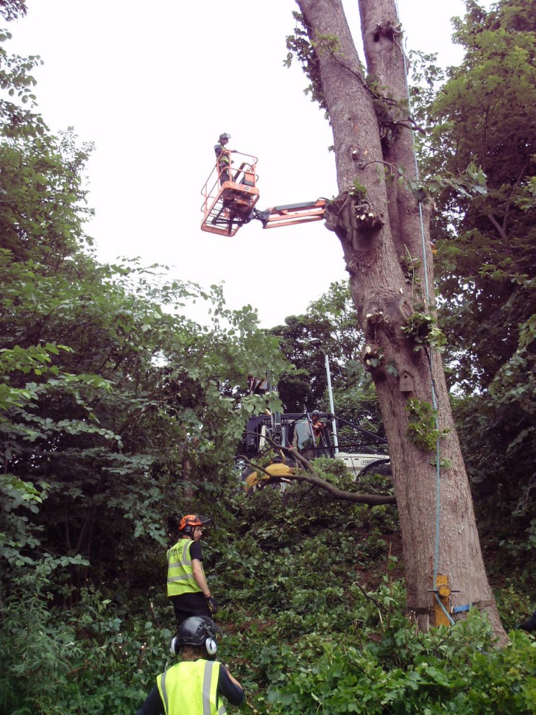 Here are some photos of Frontier removing a large Sycamore below Comiston Road. The tree had Kretzschmaria deusta (an aggressive wood-decay fungus) around the buttresses so an 80' work platform was used as the tree was unsafe to climb. Traffic management (4-way traffic signals) was undertaken by Contraflow Ltd and we had to obtain a time-consuming Road Occupation Permit. We were allowed on the road between 0930 and 1530 however with half an hour at either end to set-up and take-down the traffic management that only allowed us 5 hours to do the job and remove all brash and timber off site for recycling. 7 operatives were on site and we used the tractor crane winch to pull rope-lowered brash and timber up the bank for lifting onto the road for processing. An interesting job!