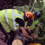 Here are the team dismantling a Norway Maple as it showed extensive decay at pollard heads and fruiting bodies on a large pruning wound. The lorry crane with fly jib was essential for this dismantle and to haul the timber offsite for recycling. An interesting job very well executed during wintery showers.